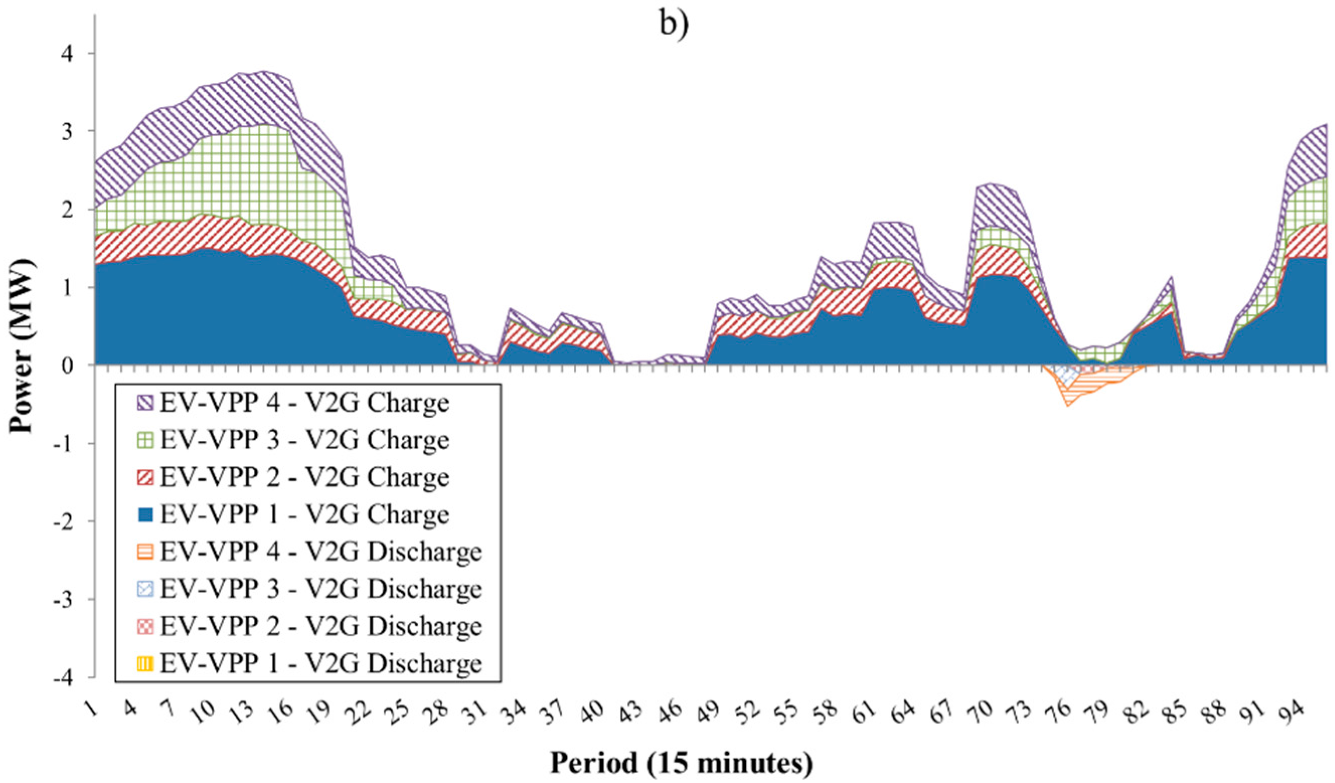 Market-based strategy: (a) total demand schedule by EV-VPP; and (b) EV’s schedule by EV-VPP.