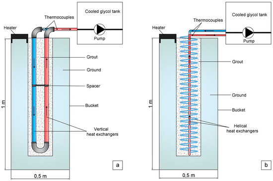 Figure 1. Schema of the vertical borehole heat exchanger reproduced in laboratory. (a) Vertical heat exchangers; (b) helical heat exchangers.