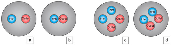 Figure 2. Position of single and double U-tube heat exchangers when using or not spacers. (a) Single U-tubes with spacers; (b) Single U-tubes without spacers; (c) Double U-tubes with spacers; (d) Double U-tubes without spacers.