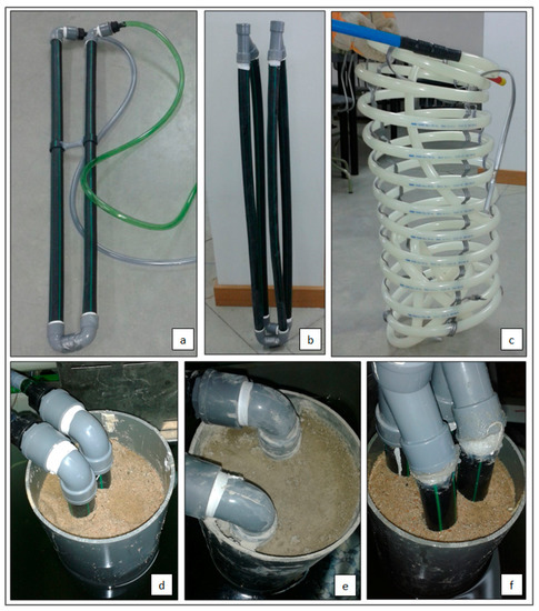 Figure 3. Images of the different configurations tested in laboratory. (a) Single U-tube heat exchanger with spacer; (b) Double U-tube heat exchanger without spacers; (c) Helical-shaped pipe; (d) Single U-tube heat exchanger without spacers and grout of saturated sand; (e) Single U-tube heat exchanger with spacers and grout of the mixture aluminium cement-sand; (f) Double U-tube heat exchanger with spacers and grout of saturated sand.