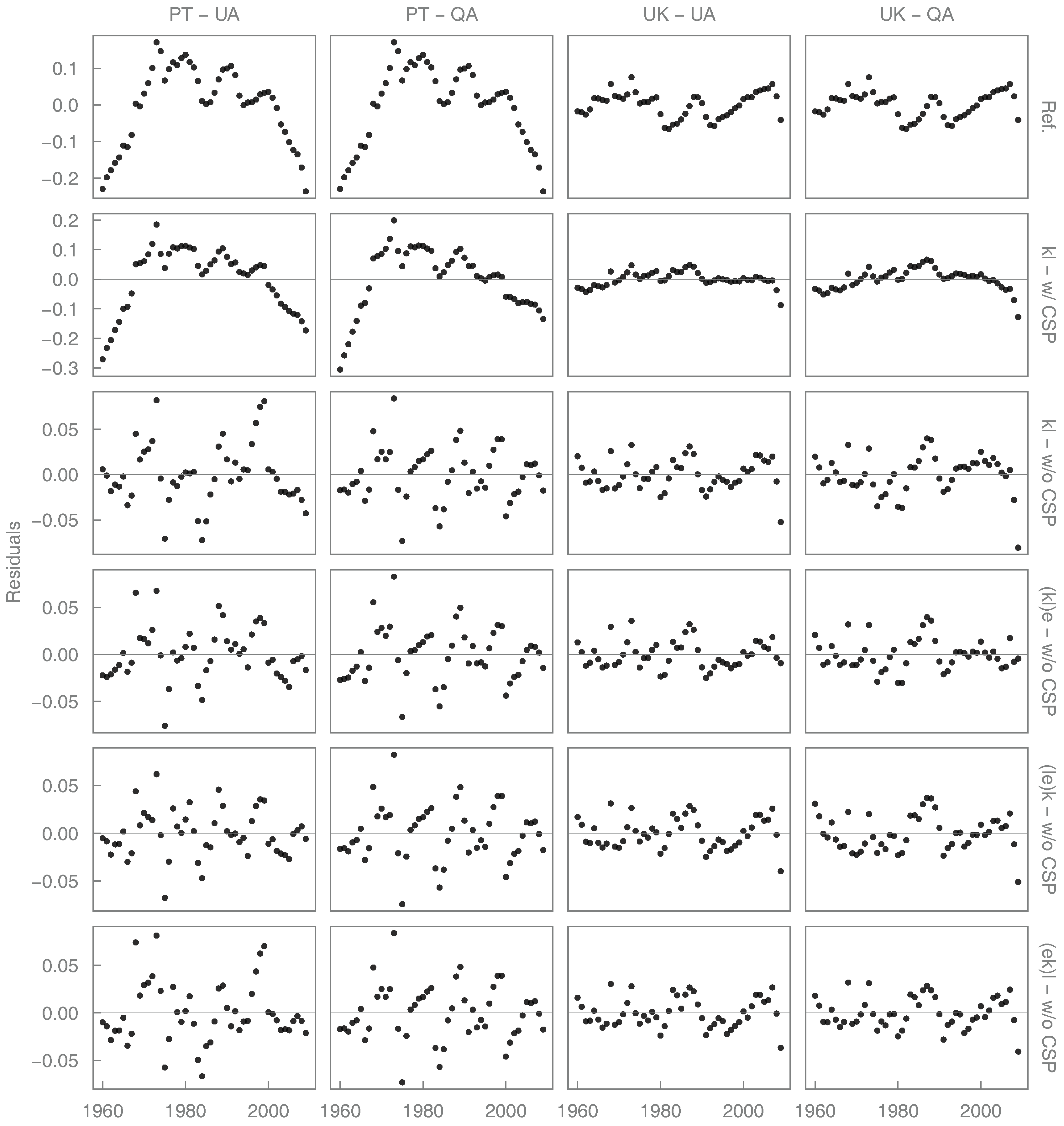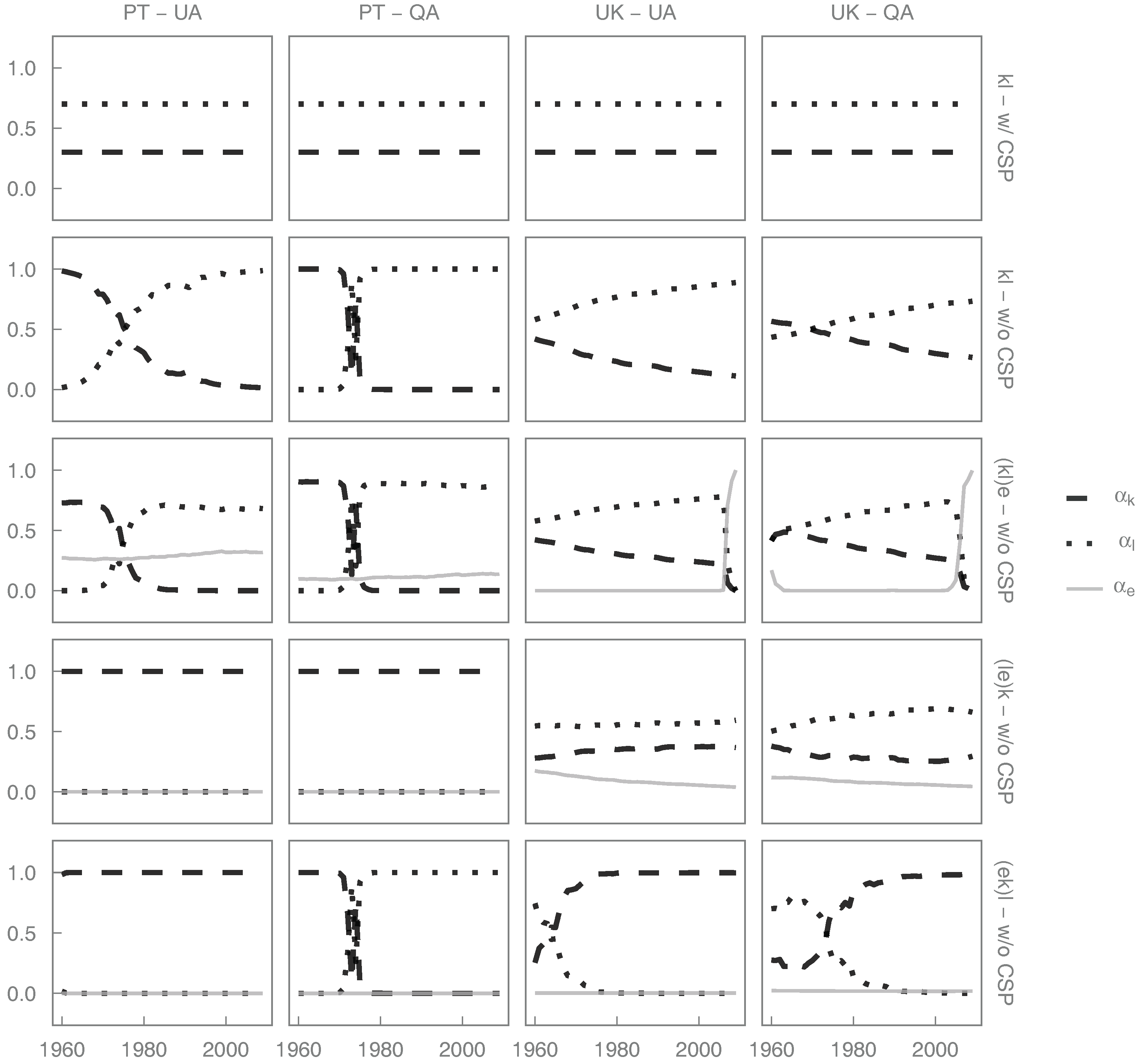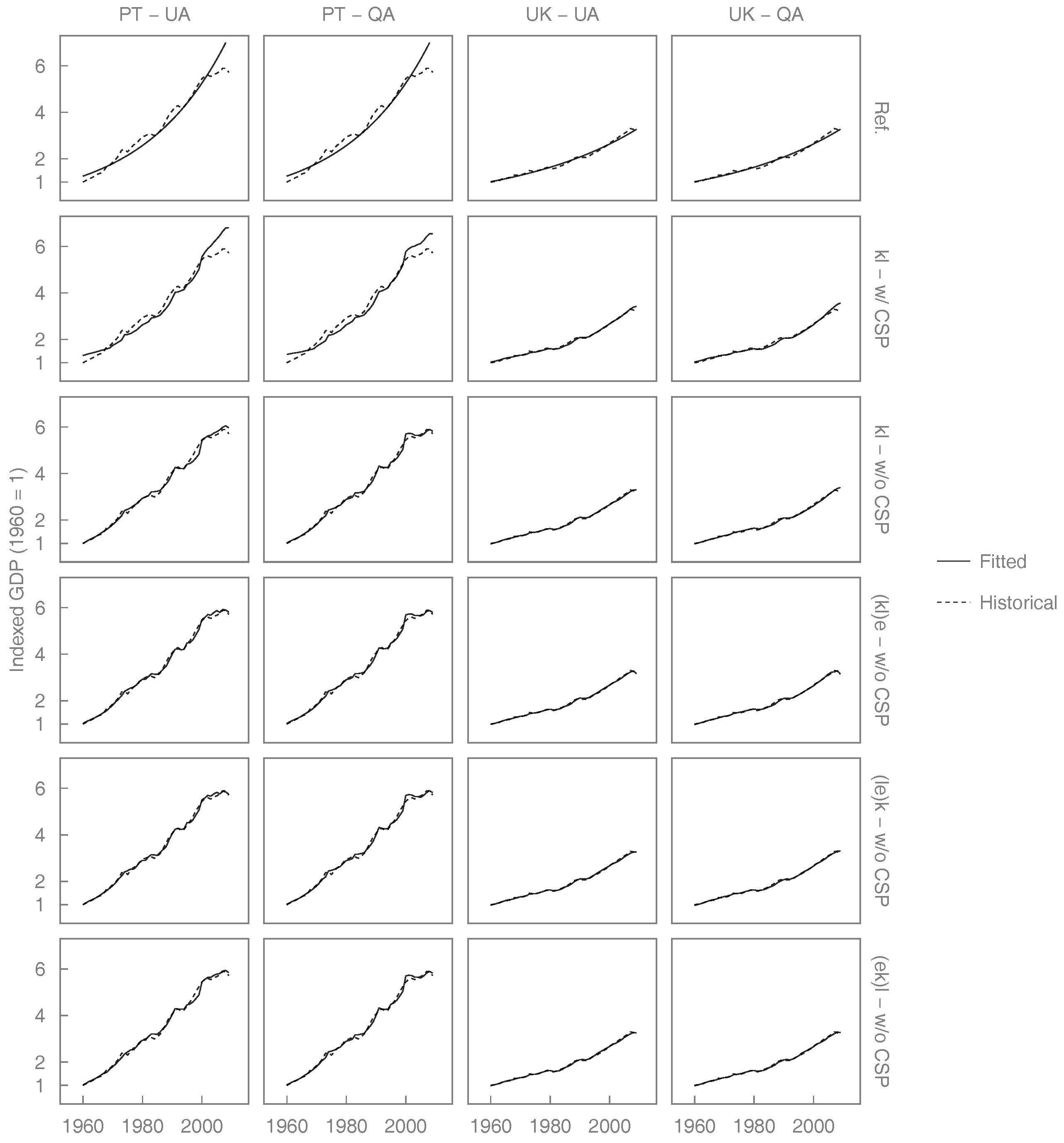 The remainder of this paper performs this evaluation by investigating the effects on policymaking of four modeling choices: (a) including (or not) energy as a factor of production; (b) rejecting (or not) the cost-share principle (CSP); (c) CES nesting structure; and (d) quality-adjusting (or not) the factors of production. We utilize historical data for Portugal and the UK for the time period 1960–2009. Furthermore, we perform bootstrap resampling on one CES production function to give an indication of the precision with which CES parameters can be estimated. We know of no previous studies that perform a similarly comprehensive, quantitative, and rigorous evaluation of the theory-to-policy process and the role of APFs therein.