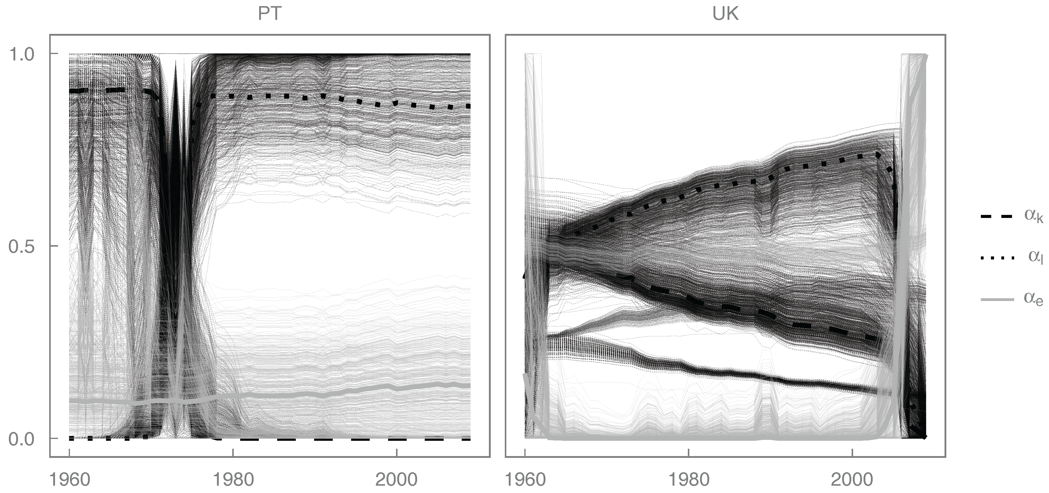 Historically, a stylized fact observed across countries verifies stable long-run cost shares for factors of production, with labor receiving approximately 70% of total income and capital the remaining 30%. This is true for both Portugal and the UK over the time period covered by this study. (See