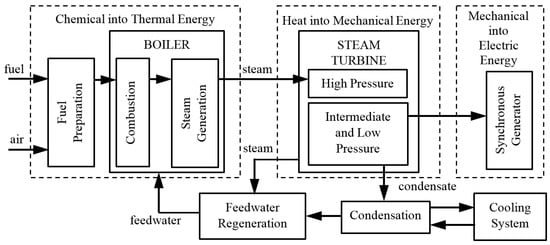 As it is almost impossible to implement any kind of heat extraction experiments without concrete pre-studies in a real power plant, mathematical modelling and simulation of the plant process cycle can be considered as the first step towards the real implementation. The mathematical model was developed for describing the major process of the transformation of the fuel chemical energy into thermal energy (heat), then thermal energy into mechanical (rotational) energy and, finally, electric energy [,,]. The structure of the system model realisation is illustrated in Figure 1.