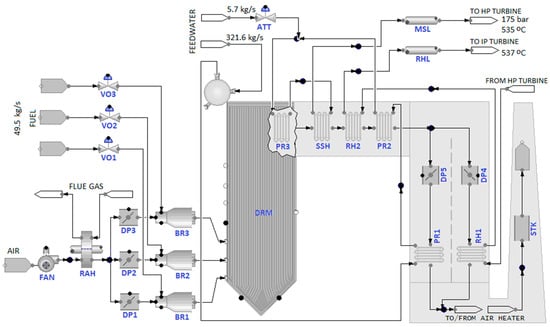 The boiler model is depicted in Figure 2. It consists of a waterwall with drum (DRM), a four-stage superheater (depicted as PR1, PR2, PR3, SSH) and two-stage reheater (RH1, RH2). The main steam temperature (MST) is controlled by the one-stage superheater attemperator (ATT). The reheater steam temperature (RHT) is controlled by flue gas circulation in the boiler second pass via two dampers’ adjustment (DP4 and DP5).