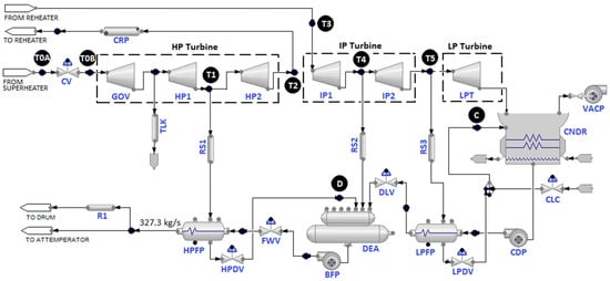Balance of Plant model implemented in ProTRAX v7.2 software environment, where: CRP, reheater inlet pipe; CV, main Control Valve; GOV, HP1 (High Pressure), HP2, IP1 (Intermediate Pressure), IP2, LPT (Low Pressure) steam turbine stages; VACP, Vacuum Pump; CDP, Condenser Pump; BFP, Boiler Feedwater Pump; DEA, Deaerator; CNDR, Condenser; CLC, make-up water control valve; LPDV, Low Pressure Preheater level control Valve; HPDV, High Pressure Preheater level control Valve; DLV, Deaerator Level control Valve; FWV, drum level control valve; R1, RS1–RS3, steam/water pipe with thermal lag; TLK, steam turbine leakage.