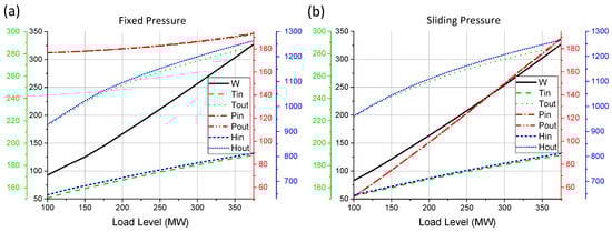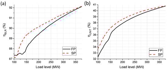 Boiler efficiency () (a) and unit efficiency ( ) (b) in fixed pressure (FP) and sliding pressure (SP) operating mode.