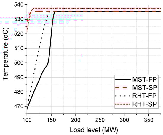 Main Steam Temperature (MST) and Reheater Temperature (RHT) as a function of load level in FP and SP operation modes.