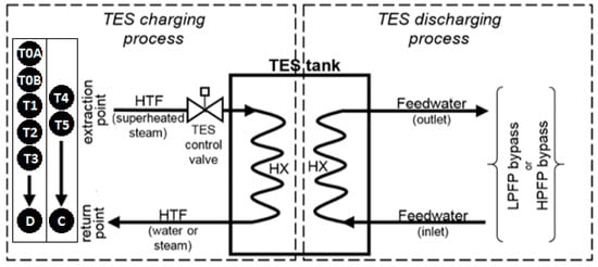 The principals of each TES system are to store heat (or cold) to be used later and overcome the mismatch between energy generation and energy use [,]. The general concept of TES integration in the power plant cycle is to take the heat out from the plant process cycle during low load demand and send it to storage. The heat should be returned back to the process loop when it is required, usually during high load demand, when the electricity price is high. The general idea of TES integration into the plant cycle is briefly explained in Figure 6.