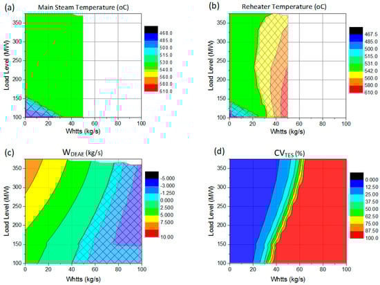 Simulation results: (a) Main steam temperature for TES charging point T1; (b) Reheater temperature for TES charging point T1; (c) Steam mass flow to deaerator (WDEAE) for TES charging point T3; and (d) TES valve opening degree (CVTES) for TES charging point T5. The crossed area represents the limit of the parameters’ range.