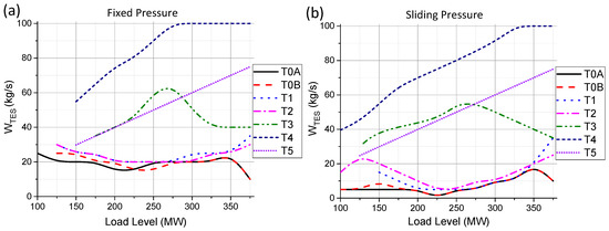 A superposition of all specified restrictions for each investigated scenario allows one to draw an available power plant operational range for all investigated TES charging points. The maximum available TES steam mass flow (WTES) is depicted in Figure 8. The maximum value is reached for location T4. The linear outcome for point T5 comes from the maximum allowable steam mass flow reached for the assumed diameter of the pipe delivering steam to TES HX. TES steam mass flow is significantly restricted for all TES extraction points located before the reheater (points T0A–T2), although in FP mode, it is possible to reach slightly higher values than in SP mode. The main benefit in SP mode is slightly extended operational range for the lowest load levels below 150 MW. It is really important that power plants are able to operate for the lowest possible load levels allowing for TES charging at the same time.