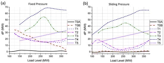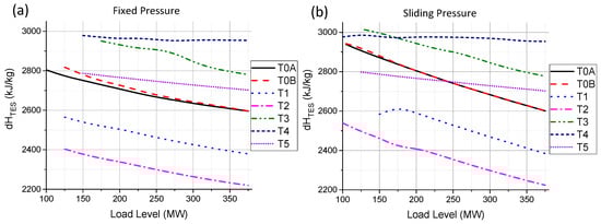 SP operation mode also allows one to get a higher difference in TES inlet and outlet enthalpies (dHTES) for all extraction points located before the reheater (Figure 9). The difference is more visible at lower load levels. The condensation process, which occurs in TES HX, helps to obtain the highest possible difference in enthalpies, as the enthalpy of saturated water is much lower than saturated steam.