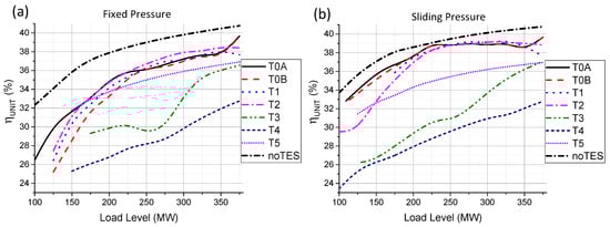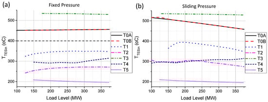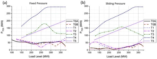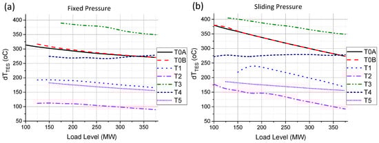 Another important factor in determining a potential TES integration is the superheated stream temperature (TTESin) entering TES HX in the charging process (Figure 13). High Temperature Thermal Storage (HTTS) systems require temperature levels above 400 °C [,,], which could be achieved only for extraction points closest to the main steam line and the reheater line: T3, T0A and T0B, respectively. The steam temperature is relatively uniform across the plant load level in FP operation mode. SP mode offers elevated steam temperature for all points located upstream of the boiler reheater due to lower pressure throttling at the TES control valve (up to 70 °C for the lowest load level). TES HX inlet temperature for all points located downstream of the boiler reheater remains at the same level, as the pressure difference between the FP and SP control system modes is marginal.