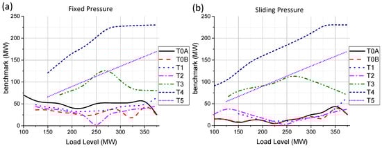 The benchmark value (benchmark) calculated according to Equation (4) is presented in Figure 12 and takes into consideration the power penalty (dP) during the TES charging process. According to the obtained results, the best candidate points are all locations downstream of the boiler reheater: points T4, T3 and T5, respectively. Slightly lower values can be reached in SP mode, but the main advantage is the extended plant operational range for low load levels.