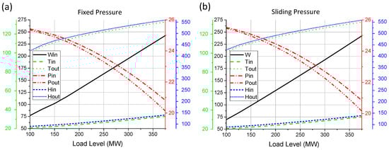 The effective power plant operational range is restricted by steam parameters, as steam temperatures at the main steam line and reheater line decrease below the rated values for certain conditions. In Figure 5, it is clearly seen that MST and RHT decrease below the rated values for low load levels. The minimum load level is restricted to 155 MW in FP mode and 110 MW in SP mode. Therefore, the minimum load level should be maintained above these values for secure power plant operation, as any rapid load change can cause steep temperature gradients, result in severe component thermal stresses and equipment lifetime decrease. Higher unit efficiency and increased plant operational range at low load levels make SP control mode more preferred and widely used in industry.