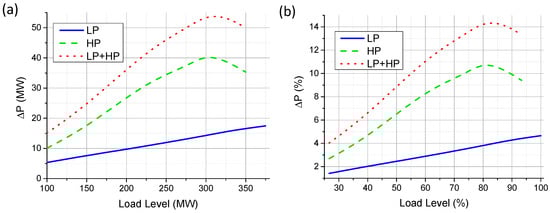 Power plant capacity increase (ΔP) for the TES discharging process: (a) in MW; (b) in % of registered capacity; where, LP: low pressure feedwater preheater bypass; HP: high pressure feedwater preheater bypass; HP + LP: both LP and HP feedwater preheaters bypass.
