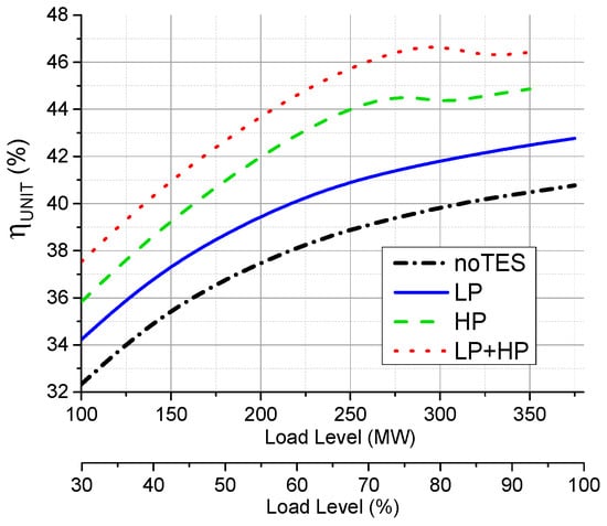 As the power output increases during the TES discharging process, the unit efficiency () calculated based on Equation (2) also increases. The simulation results are presented in Figure 19. LPFP bypassing allows for a 2% efficiency increase in the entire load level range, whereas HPFP substitution allows for a further efficiency increase to the maximum value of 45% for load levels above 75%. The highest available efficiency can be achieved for both HPFP and LPFP bypassing and can reach 47% for load levels above 80%.