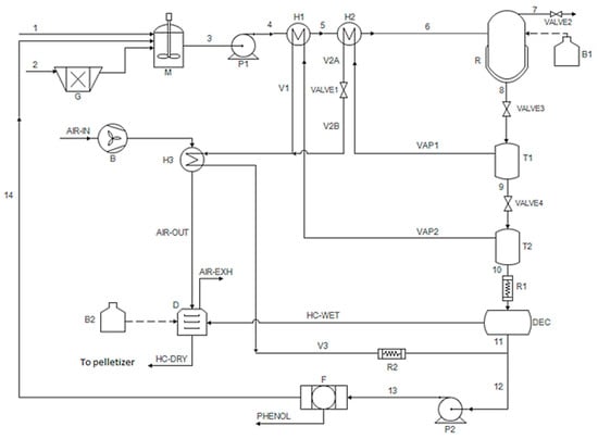 The pump raises pressure to feed the slurry to the HTC continuous reactor. The heat exchangers preheat the biomass slurry. Next, the mixture (stream 6) enters the top of the reactor (R), while the HTC slurry, containing hydrochar and aqueous products, is removed from the bottom (stream 8). Gases formed during the reactions escape from the upper part of the reactor, passing through a valve (VALVE2) that, together with VALVE3, regulates pressure inside the reactor. The methane burner (B1) raises the temperature of the preheated biomass slurry up to HTC temperature (180–250 °C). The HTC slurry is then depressurized in two stages in flash tanks T1 and T2. The slurry exiting T2 is conveyed to a decanter (DEC), where liquid-solid separation is performed. The solid, i.e., hydrochar (stream HC-WET), is then transferred to an air-dryer (D), fed by an air blower (B), and heated by methane burner B2. After drying, the hydrochar produced is transferred to a pelletizer. Vapors produced by the expansion of the liquid slurry (streams VAP1 and VAP2) are used to preheat the biomass slurry in H1 and H2 and the air (stream AIR-IN) to the drier in heat exchanger H3. The condensed vapor (stream V3), together with the liquid exiting the decanter (stream 11), is pumped (P2) in order to be recycled to the process. Filter F separates organic liquids (phenol in the current simplification) from process water, which is recirculated to mixer M. The presence of filter F is not mandatory: the liquid from the decanter (DEC) could be recycled to the process—totally or partially—which could be beneficial in terms of increasing hydrochar yields [15,16]. Vice versa, if the HTC process aqueous phase is recovered for other applications, for instance as a liquid fertilizer, the use of the filter becomes an obvious choice. In this case, the separation of phenol-like compounds from the liquid is required because phenols are toxic species for plants. Considering the above, to be conservative, we considered the presence of the filter F (activated carbon filter) in the HTC process scheme, and its pressure drop was estimated to be 1.5 bar.
