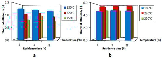 More precisely, thermal efficiency was computed as the ratio between the HHV of the produced dried hydrochar (i.e., hydrochar exiting the dryer with a residual 8% moisture content, see Appendix A)—expressed in kWh/kghydrochar—and the overall thermal energy required by the plant—expressed in kWh/kghydrochar. Hydrochar HHV was computed by referring to linear correlations between hydrochar yield and HHV extrapolated from the experimental data previously obtained by our research group [17,18]. Such HHV data refers to dry hydrochar, and was duly modified to take into account its residual 8% moisture content. The plant’s overall efficiency based on HHV was estimated through Equation (3), as proposed by Stemann and Ziegler [16]: