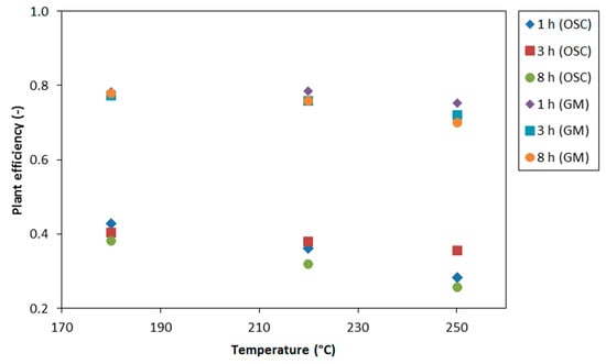 Plant efficiency at different HTC temperatures (180, 220, 250 °C) and residence times (1, 3, 8 h) for OSC and GM.