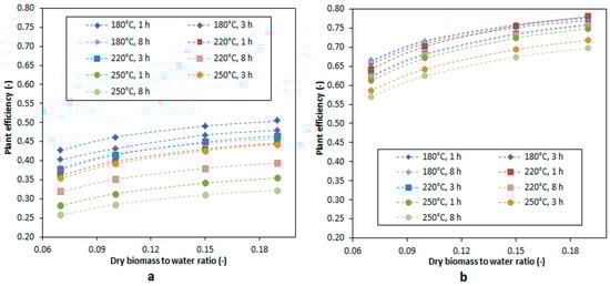 When accounting for HTC reaction heat (see Appendix A, Appendix A.5 Reactor), plant efficiency increases by about 1%–2%. Considering the great impact of DB/W on efficiency, the process model was run varying this parameter in the range 0.07–0.19 for both substrates. As a simplifying assumption, solid, liquid and gas yields were supposed not to depend on DB/W. The parameter that should be most affected by DB/W is the TOC of the HTC liquid. The higher the DB/W, the higher the TOC should be, i.e., the higher the phenol and organic acids concentration in the aqueous stream. For simplicity, such dependence was ignored here, the focus being on energy efficiency, which is influenced by liquid composition to a very negligible extent. The results of such analysis are depicted in Figure 6.