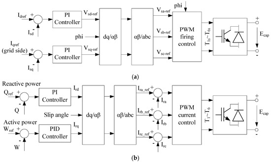 Block diagrams of induction machine control for the DFIG tidal current turbine, (a) current reference Pulse Width Modulation (PWM) based rotor side converter and (b) synchronised PWM based grid side converter.
