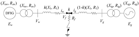 When a phase-A grounded (AG) fault occurs at location k, as shown in Figure 4, then , the zero sequence current of DFIG side of the line , and the zero sequence current of grid side of the line , where and are three-phase currents supplied from both ends. Hence, the electrical topology of the system will change accordingly. The differential equations of phase A can now be described by Equations (2)–(6), where is the voltage at the fault location and represents ground transient resistance; and are the zero sequence voltage at the neutral connector of the transformers of both sides, respectively; and are the zero sequence impedance of the line, and fault location k is represented by its percentage (0–1) of the line: