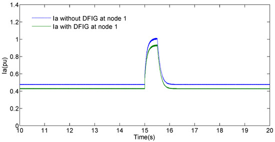 Phase-A currents at node 3 with and without DFIG connected, where an AG fault is applied at node 3.