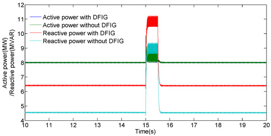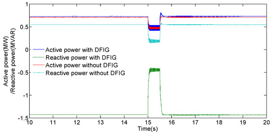 There is no instability problem for active and reactive powers during the observation period, as shown in Figure 6. Therefore, when connected to node 1, the DFIG tidal current turbine will supply more active power, thus increasing the power output level of the system. The active power also has less power fluctuations during the fault. Figure 6 also shows that the reactive power is relatively lower in a steady state; however, there are significantly increased oscillations in reactive power during the fault in the case when the DFIG is connected. This is because the DFIG tidal current turbine added in the system can greatly improve the low voltage ride through (LVRT) capacity by providing less active power fluctuations and good reactive power compensation during the grid fault period.