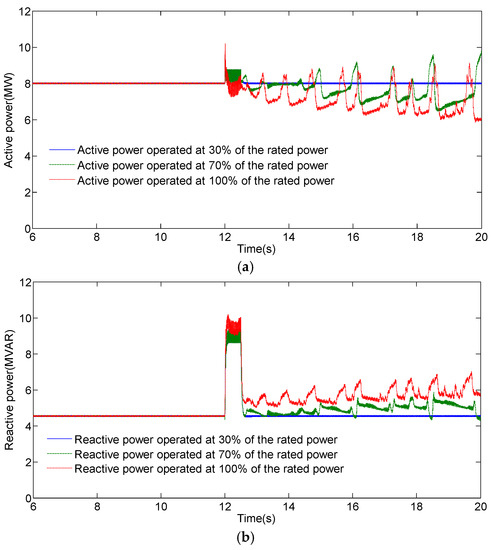Figure 9 also shows the case when the tidal current farm is operated at 100% rated power of 3.5 MW. The tidal current speed is set to 3.5 m/s, which is higher than the rated tidal current speed, in order to keep the DFIG on a full rated output power. The value of active power within a pre-fault period is larger than that during the post-fault period, while the value of reactive power has the opposite situation. Compared to the 70% case, it can be found that the active power operating at 100% rated power exhibits oscillations with a higher frequency. On the other hand, reactive power is very responsive, implying that more reactive power comes from the full rated power than from the 70% rated power of the tidal current plant.
