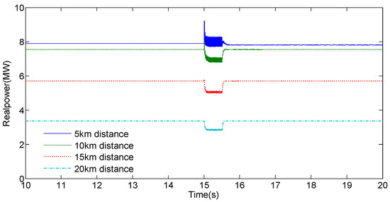 In this subsection, we perform simulations of the network with a certain connection distance between the grid source and the DFIG tidal current turbine. Take wind farms, for example, particularly small-scale ones. The HVAC system is normally preferred for short distance power delivery (less than 50 km) [35]. Therefore, four short distances of 5 km, 10 km, 15 km and 20 km are considered for the tidal current turbine with rated power of 3.5 MW being analysed in the paper. From the simulation results, as shown in Figure 10 and Figure 11, we can conclude that when the tidal current turbines are added in the distribution grid, the closer to the grid source, the larger the active power of the system at node 1 would be. The same result applies to the reactive power. Additionally, the closer to the grid source, the less the oscillations of both active and reactive powers are evident during the grid fault. Furthermore, the change of active power with the connection distance seems not apparent during the fault; however, the shorter the connection distance, the larger the increase in reactive power during the fault.