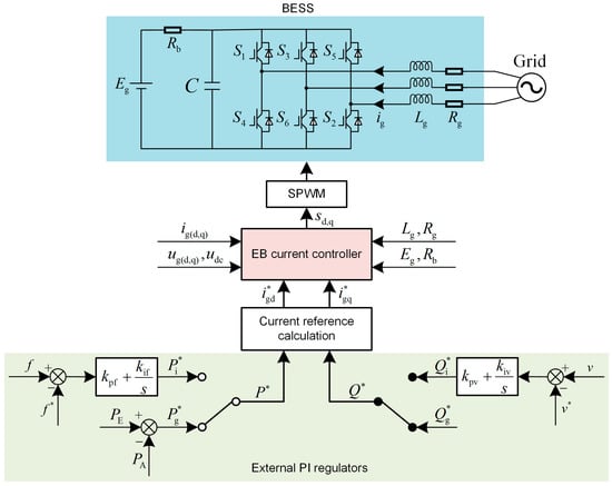 The EB controller design depends on the topology of the BESS. The d-q axis mathematical model for BESS as shown in Figure 2 is provided in Equation (2). It should be noted that the mathematical model could be different according to the converter system. Nevertheless, the design process of EB control for a BESS is similar and can be extended to the general MG configurations:
