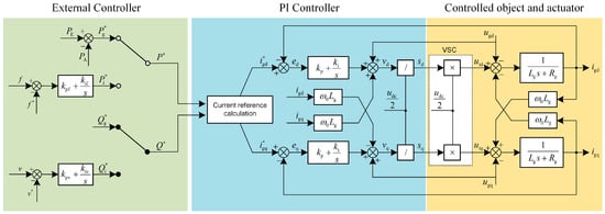 As a contrast to the EB method, the conventional PI controller should be carefully designed. The control diagram of the system in the d-q frame is illustrated in Figure 3. In the actuator, there are two unfavorable factors for the control, which can be seen in Figure 3. One is the coupling characteristics of the BESS current between d and q axis, and this will lead to the difficulties for the controller design. Another one is that the grid voltage is a disturbance for the BESS current control, which will deteriorate the transient performance of the system. To resolve these problems, we adopt the classic current feedforward decoupling PI control strategy [30]. In Figure 3, is the current tracking error. After a PI regulator, we decouple the BESS current control in the d-q frame and feed forward the grid voltage to restrain the disturbance. is the sum of PI regulator output and feedforward decoupling part. Considering that VSC is equivalent to a proportional amplification, to simplify the design, we divide by the magnification to gain the duty ratio , and this will make the equivalent PWM magnification . is the output voltage of VSC.