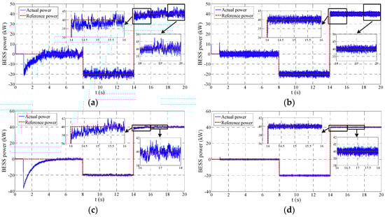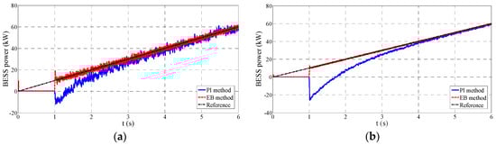 Figure 4c,d provides the step response in the case A2. It can be observed that the EB method maintains its exceptional performance both in the transient and steady state. On the contrary, the PI method has a worse recovery process compared with Figure 4a. The overshoot increases to −36 kW and the adjusting time extends to nearly 4 s. At 14 s the PI method presents a slower tracking process.