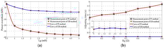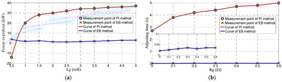 Figure 5a provides the power overshoot (at 1 s) when Lg changes and Rg is fixed to 1.1 mΩ. Figure 5b shows the adjusting time when Rg changes and Lg is fixed to 1 mH. It can be found that the performance of the PI method is significantly affected by the parameter change whereas EB method has a superior robustness to parameter uncertainty.