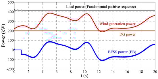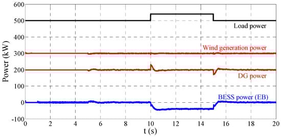 BESSs are utilized to regulate the frequency and voltage in the islanded mode. The real power and reactive power references of a BESS are generated by extra f-p and v-q PI controllers, respectively. In this scenario, we assume the wind generation is constant at and the initial load is . At 5 s the MG goes into islanded mode; at 10 s a resistor is connected to the MG, and it is disconnected at 15 s. Figure 12 provides the power of some principle components of the MG in the islanded mode test.