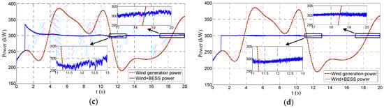 Performance on power smoothing. (a) PI method (case C1); (b) EB method (case C1); (c) PI method (case C2); and (d) EB method (case C2).