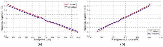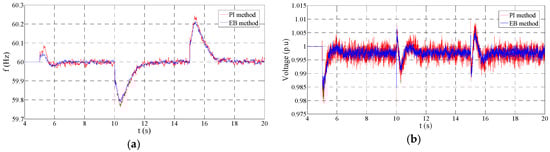 Figure 13a compares the frequency regulation performance between the PI and EB methods, and Figure 13b demonstrates the contrast on voltage regulation. The performance of the PI and EB controllers is quite similar because the control performance mainly depends on the external f-p and v-q PI controllers and their outer PI controllers are the same. However, it can be found that the EB controller has a better transient performance and a lower ripple compared with the PI method.