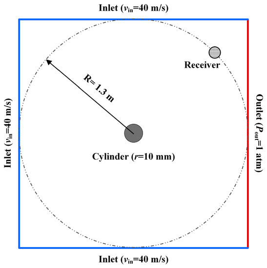 To verify the FW-H model used, a 2D cylinder case was first studied and its computational domain and the boundary conditions are shown in Figure 5. It should be pointed out that the receiver is placed at a distance of 1.3 m from the center of the cylinder to accord with the experimental set-up [21]. A constant velocity of 40 m/s is specified at all the inlets, whereas an ambient pressure of 1 atm is used at the outlet. A structured mesh system of about 90,000 cells is used and the finest cell has a minimum edge length of 0.005 mm. Figure 6a shows the predicted and measured sound pressure spectra. As can be seen, the prediction matches rather well with the measurements at the receiver. Furthermore, the two peak frequencies at 800 Hz and 1500 Hz are adequately captured. Figure 6b displays the pressure coefficients around the cylinder surface. The simulation displays the overall trend regarding the pressure coefficient obtained in the experiment with a maximum discrepancy less than 10%.