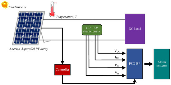The schematic diagram of our proposed fault diagnosis system is shown in Figure 1. It is mainly composed of a 4 × 3 (4 in series, 3 in parallel) PV array module, with DC load, alarm systems, and data processing modules acquiring and recording the state of the PV system. A triple-layered heuristic PSO-BP neural network is used as the diagnostic tool.