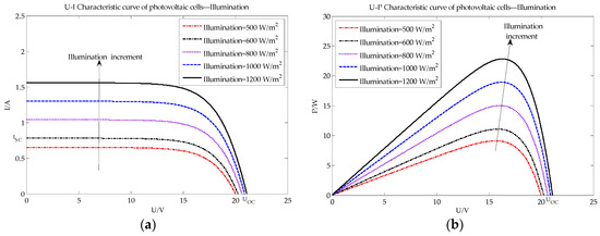 As Figure 3 shows, due to the PV effect, the photons exceeding the PV cells’ bandgap excite a large number of electron hole pairs, which then generate electromotive force and current. Therefore, with increasing illumination of the PV cells, the Isc, Voc, Pm and Vm increase.