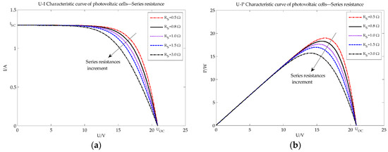 PV characteristic curve under different series resistance conditions: (a) U-I characteristic curve of PV array; (b) U-P characteristic curve of PV array.