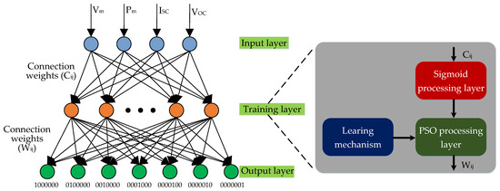 The PSO-BP neural network is a model combining features of the global search ability of PSO with the local search ability of a BP neural network [16]. In order to get the solution of PSO quickly, a heuristic model of the PSO-BP neural network is used in this paper to predict the faults of the PV array. In our model, the test data are normalized and delivered to the benchmark input layer, and are subsequently trained and proceed with a sigmoid function in the benchmark training layer, on which the classification and learning mechanism are built. In practice, the recorded real-time fault data of the PV system proceed in the same way and are imported into the PSO processing layer to optimize fault classification. The results of the optimization are obtained in the output layer. The schematic diagram of the triple-layered heuristic diagnostic method is shown in Figure 5.