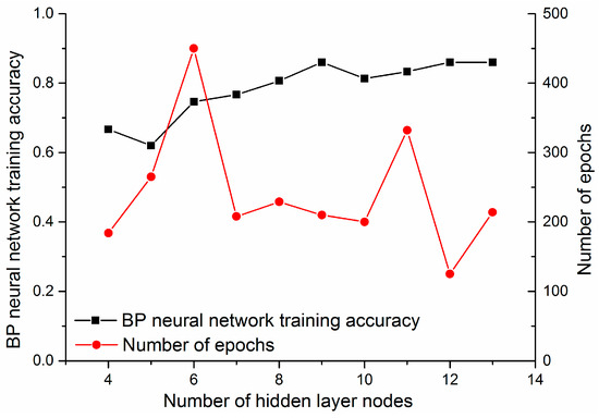 The connection weight connects neuron i of the hidden layer and neuron j of the input layer of the BP neural network by the sigmoid function, while the connection weight connects the output layer and the hidden layer by the linear function. The training deviation and epochs corresponding to the neurons are illustrated in Figure 6. The line with red dots indicates the number of epochs when the BP neural network is trained by increasing the neurons of the hidden layer, while the line with black squares illustrates the training accuracy of the BP neural network with the increase of the hidden layer neurons. As shown in Figure 6, when the number of neurons in the hidden layer is 12, the training accuracy of the BP neural network is over 80%, and the number of epochs is about 100 steps.
