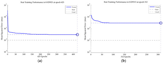 The training mean squared error in two methods. The blue solid line is the mean squared error in the training process, while the dot line is the target mean squared error in the MATLAB. (a) The training mean squared error of the BP neural network; (b) the training mean squared error of the PSO-BP neural network.
