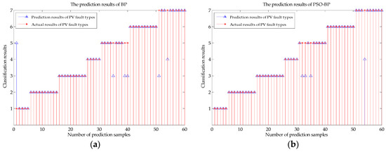 The prediction results for the two methods. The blue triangles are the prediction results of the two diagnostic methods, and the red asterisks are the actual fault classifications of the 60 test samples. (a) The prediction results of the BP neural network; (b) the prediction results of the PSO-BP neural network.