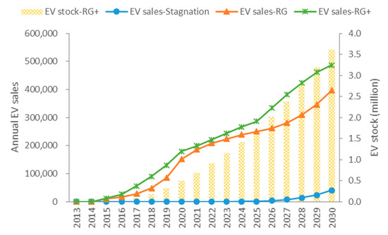 There is a sharp difference in terms of the shares of EVs between the Stagnation scenario and the RG/RG+ scenarios. It is interesting to examine which factors led to such dramatic differences. Technological progress is the primary factor for the diffusion of EVs. The pace of technological change determines the price of battery systems and EVs, which are the biggest concerns for most consumers. This is consistent with the findings from Hou’s research that battery price is one of the most significant economic parameters in the total cost of vehicle ownership [26]. On the contrary, the cost of EVs will decline with the expansion of market size. After EVs reach cost parity with conventional vehicles, the advantage in fuel cost is gradually revealed. Technological progress also brings about better battery performance. With improvements of energy density, EVs can carry batteries of larger capacity under the premise of not increasing the curb weight, which means longer range and less range anxiety. With the extension of battery life, which is expected to be comparable to vehicle life, consumers don’t need to worry about extra expenses for battery exchange.
