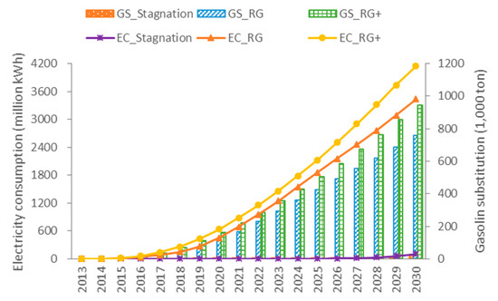 Electricity consumption (left axis) and gasoline consumption saved by electric vehicles. GS: Gasoline substitution; EC: electricity consumption; RG: rapid growth; RG+: rapid growth plus.