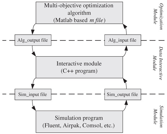 The general optimization framework is described in Figure 1. Within the framework, the problem is divided into three modules: the simulation module consists of any standard simulation program, such as Fluent, Airpak, Comsol, etc.; the optimization module is designed using Matlab, in which various single/multiple-objective optimization algorithms are realized; the data interactive module is constructed by a C++ program, which is used to couple CFD simulation with Matlab-based optimization algorithms without requiring code adaptation.