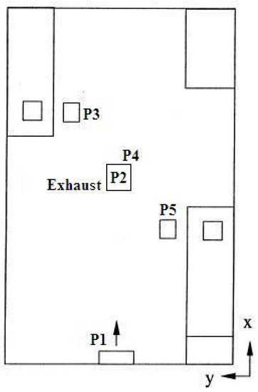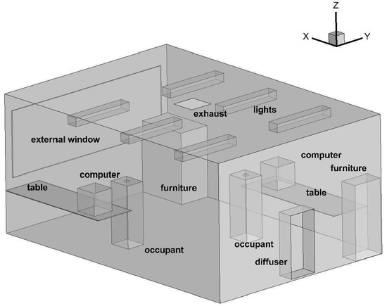 A two-person office room of m length, m width, and m height (Figure 3) is modeled, which was investigated experimentally by Yuan et al. [25]. The room is equipped with two tables, two heated computers, two file cabinets, and six overhead lights. A m × m window is mounted on the left wall. A perforated displacement diffuser (0.5 m × 1.1 m) is placed at the middle of the right side wall near the floor. The exhaust (0.43 m × 0.43 m) is at the center of the ceiling. The two sitting occupants in the test room are simulated by two boxes of 0.4 m × 0.35 m × 1.1 m. Two point sources of CO are introduced at the top of the two boxes to simulate contaminants from the occupants, with an initial velocity of 0.045 m/s in the horizontal direction. The other details of office configuration can be found in Table 1 and [25].