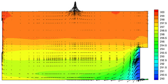 The steady temperature contour (K) and airflow pattern computed by the CFD program (the midsection through the diffuser).